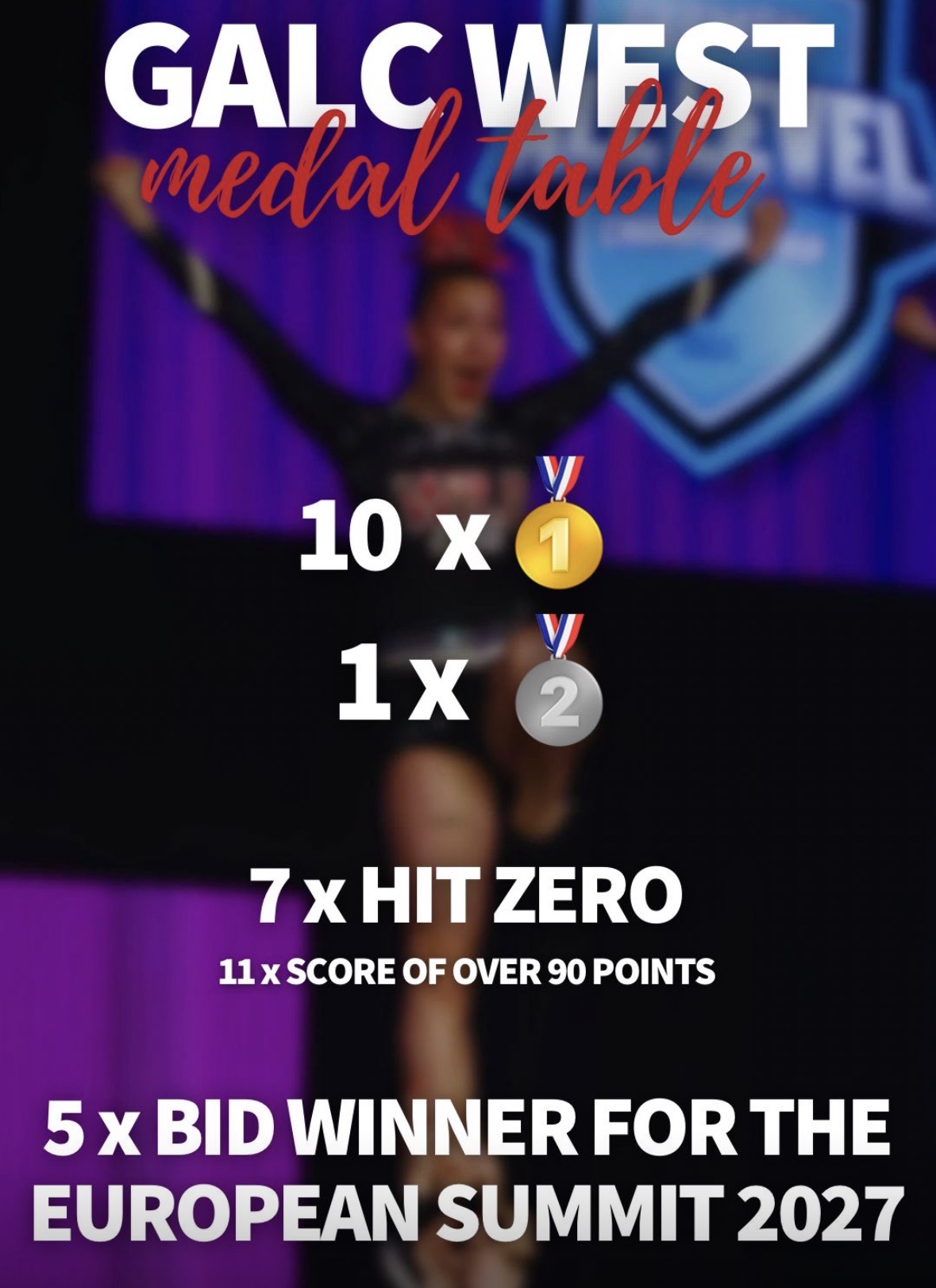 10x Platz 1, 1x Platz 2 und 7x Hit Zero , 11x einen Score über 90 Punkte und dazu 5x BIDS für die European Summit im Jahr 2027. Die German All Level Championship West war für die Wildcats Cheerleader Leverkusen ein voller Erfolg.